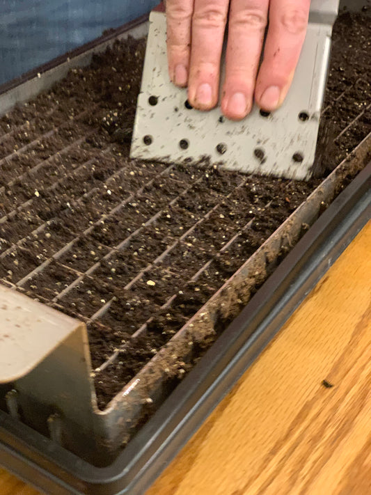 Place the bottom tray on a smooth worktable and fill it with your favorite soil blocking mix. We’ve found no need to sift as the block size allows for larger imperfections in soil consistency. Make sure to pack each corner and side for blocks to be consistent.